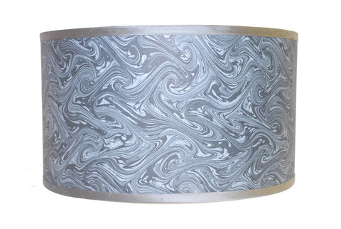 Italian Marbleized Paper LampshadeMade from marbleized Italian paper, this grey-hued shade has a light grey silk bias trim along the edges. Size: 16" Diameter x 9.25" Height Silver Spider casing.
